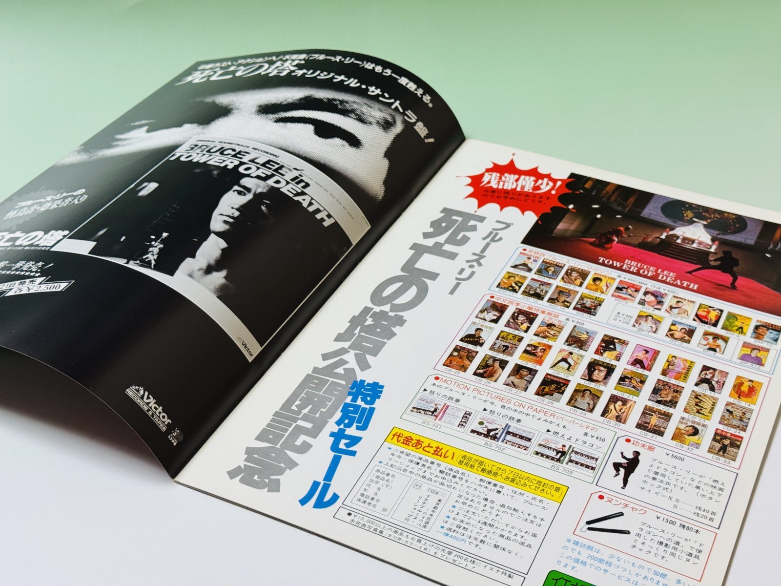 ■1981年、東映によって公開された幻のブルース・リー主演作『ブルース・リー 死亡の塔』は当時観たものにまた違った意味で衝撃を与え、そしてブルース・リー氷河期へと突入するきっかけとなってしまった迷作。しかし40年以上が経った今、ブルース・リーと本作に関する研究が進むにつれ、本作の不思議な魅力に取りつかれるファンが続出している。というわけで本日、当店倉庫で発見された中古品のパンフレットですが全体的にはけっこうきれいな状態。中はほぼ新品といってもいいくらいです。現品一点限りです。