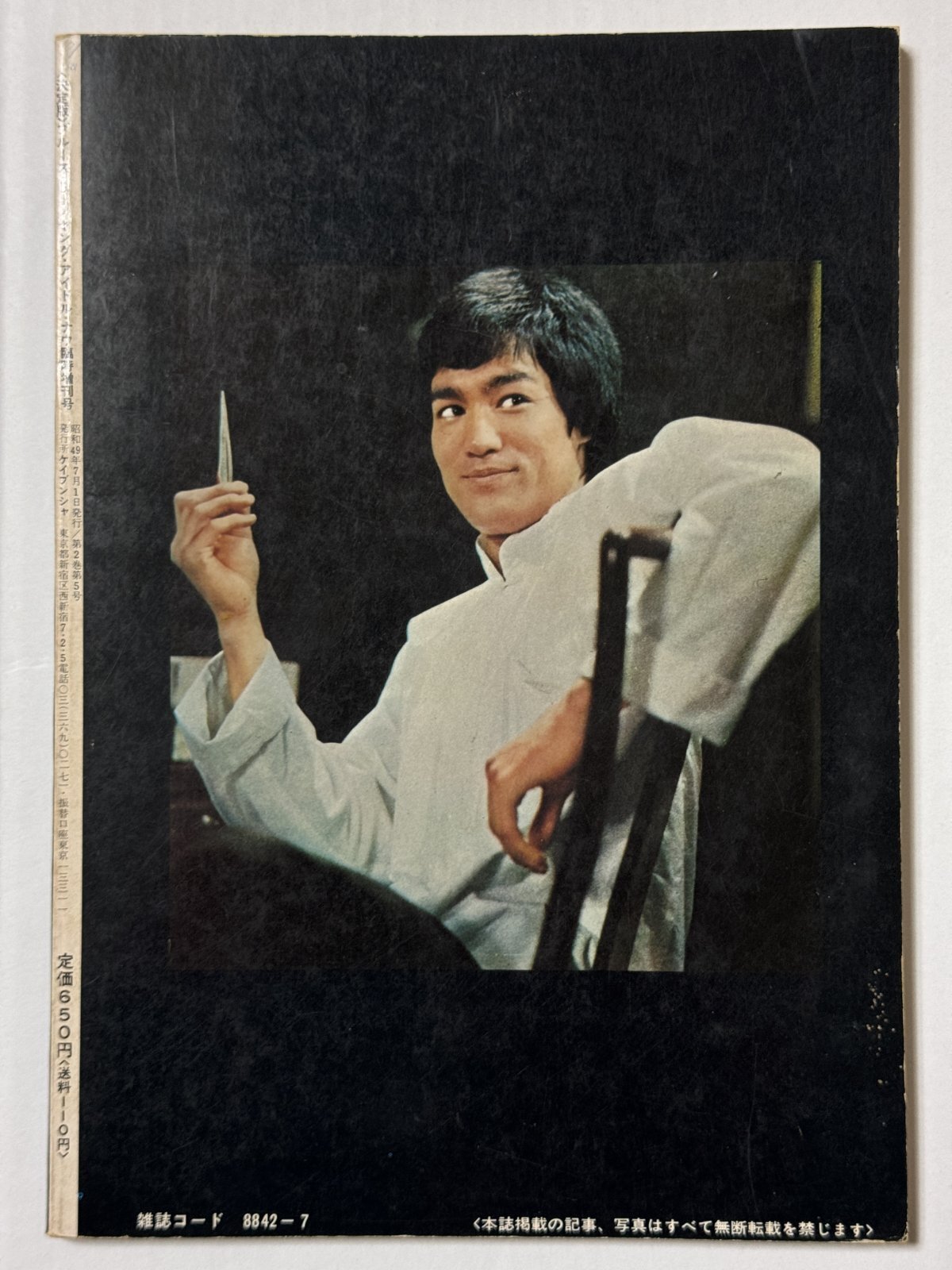 おなじみケイブンシャのヤングアイドルナウ別冊、ブルース・リーシリーズ。『ドラゴン怒りの鉄拳』公開前、一周忌でブーム最高潮の時期の出版。多くのカラー写真、モノクログラビア写真で埋められています。中古品なので、表紙などに若干の擦れや使用感がありますが、さすが青野コレクション、中は新品同様。現品一点限りです。最終ページの懸賞応募券は切り取られています。