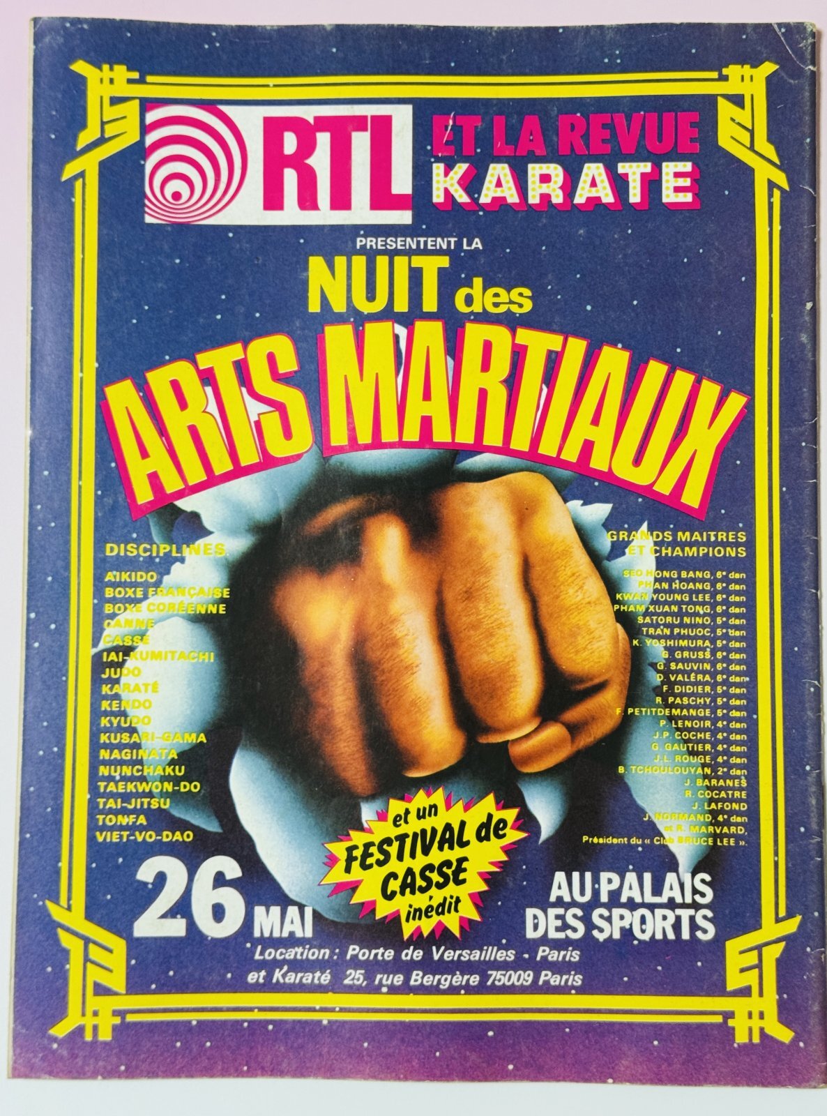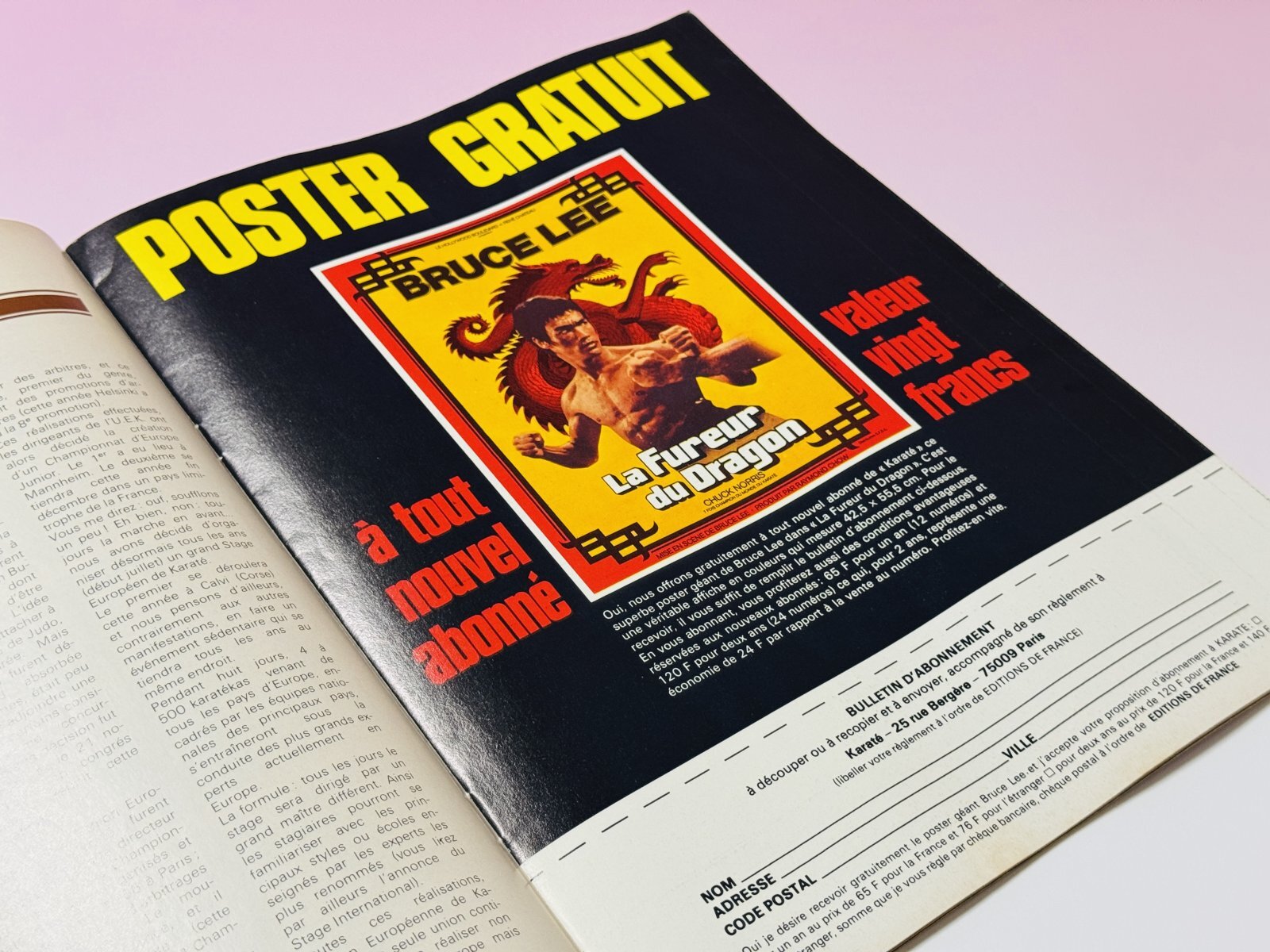 ■当店倉庫から発見されたフランスの格闘技雑誌KARATEです。表紙はブルース・リー!でも中には特にリーさん関連の記事はないです。でも、とじ込み付録でアイロンプリント付き。あと、『ドラゴンへの道』ポスター通販広告とブルース・リークラブ?広告ありです。