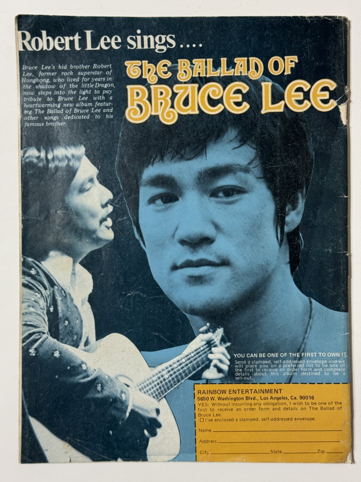 ■当店倉庫から発見された、たぶん1974年発売のアメリカ格闘技雑誌のブルース・リー特集号。ブルース・リーのキャリアを過去の格闘技雑誌に掲載された記事を集めて構成。元の掲載紙は、BLACK BELT誌、KARATE ILLUSTRATED誌、FIGHTING STARS誌の3誌。一冊丸ごとブルース・リーで、例によって今見ても珍しい写真もあります。古いものです。右上部に軽い折れ、表紙全体に傷み、わずかな破れがあります。中身は目立った傷みはなく、良い状態です。裏表紙、ロバート・リーのレコード広告も良いね。