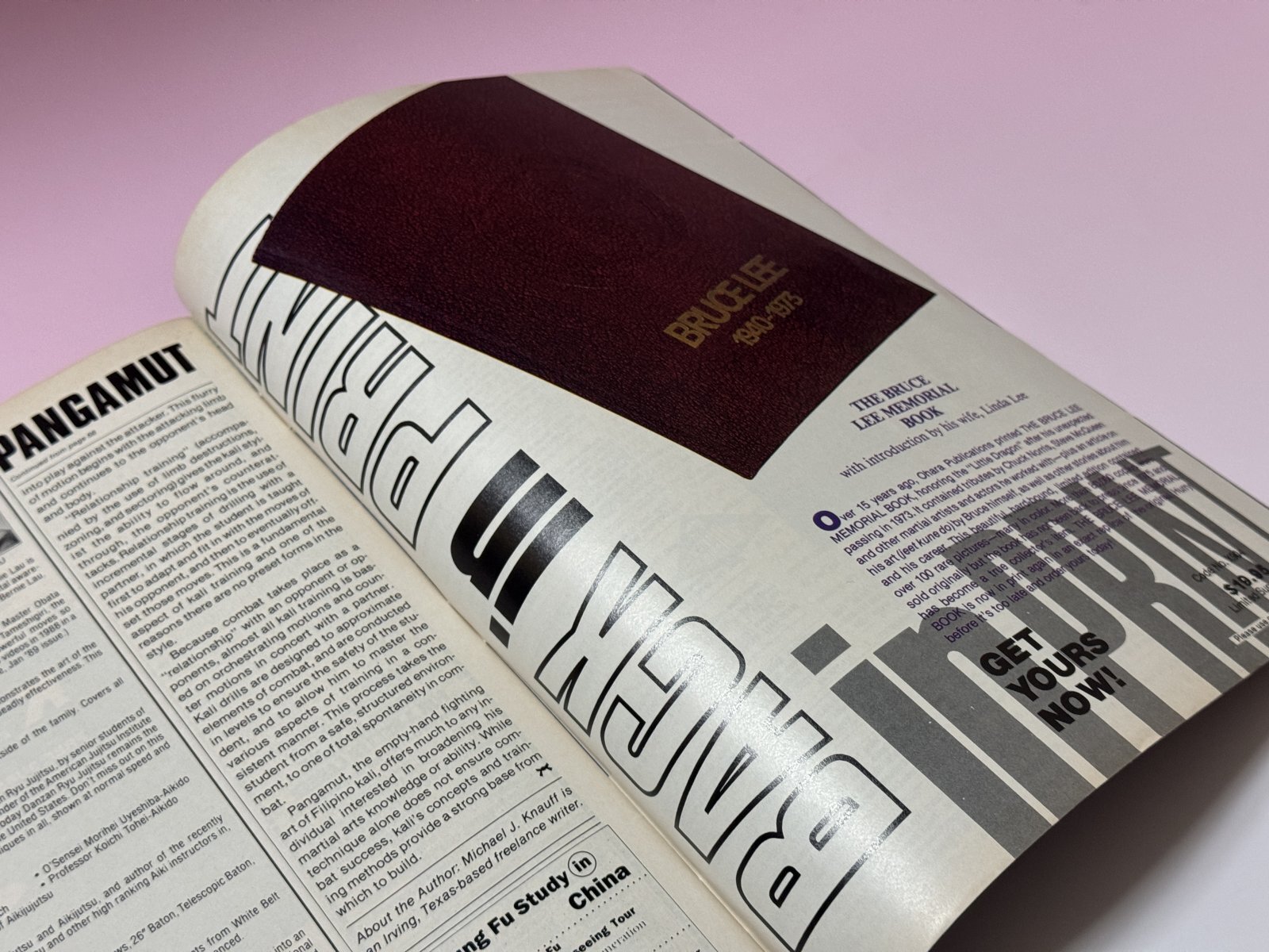 ■1980年代のアメリカ格闘技雑誌。この表紙の素晴らしさ!掲載記事は『ブルース・リー、ハリウッドへ行く』4ページ掲載。ほかにブルース・リー関連書籍のカラー広告が美しい。古いものですが状態は新品に近い状態だと思います。