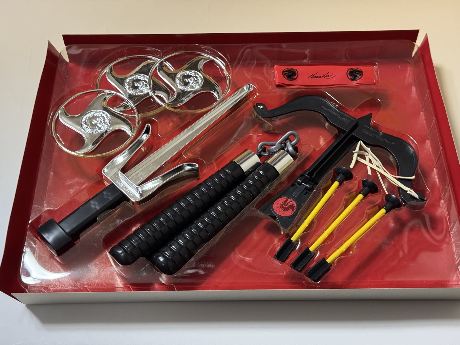 ■かつてトイザらスではこんな商品が売られていました。ヌンチャク以外は外国人が好みそうなニンジャグッズのような武器セット。未使用品ですが内容確認のために開封しました。中は手裏剣みたいなもの、サイ、ヌンチャク、そしてクロスボー。クロスボーのゴムは経年劣化でボロボロになっています。ご了承ください。