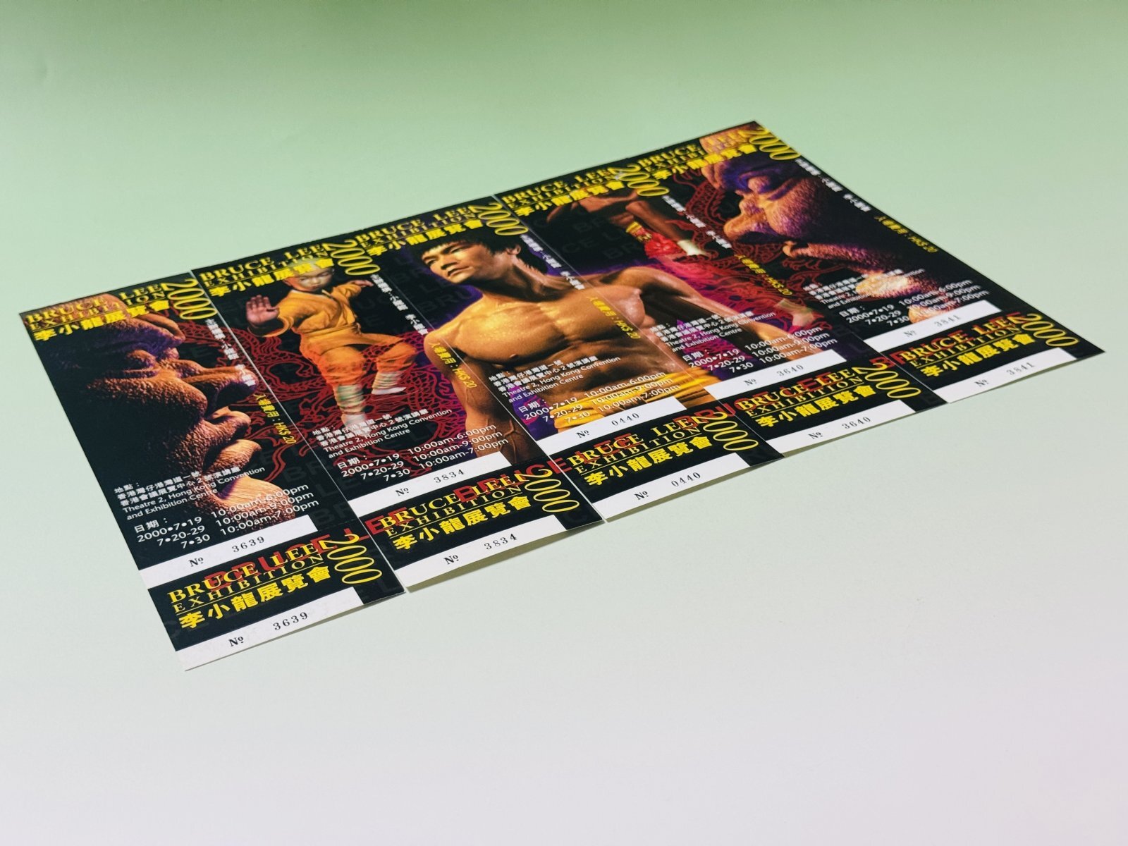 ■店長がまたまた!倉庫から発掘したマニア向けグッズ、これは・・・自分のコレクションなのか、デッドストックなのか、もう自分でもわからなくなってきた店長が泣く泣く手放す貴重グッズ。香港李小龍會が2000年に開催したブルース・リーエキシビジョン=李小龍展覧會2000の入場チケット。絵柄が5種類あり並べると1枚の絵柄になるという凝りよう。5種5枚セットでお送りします。