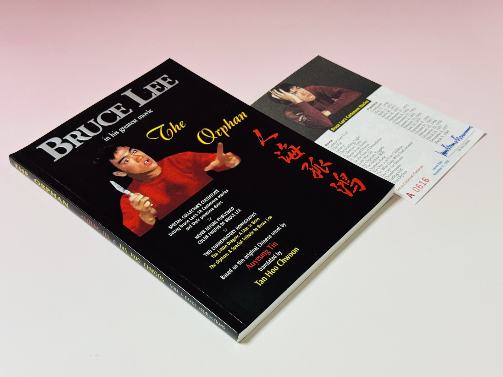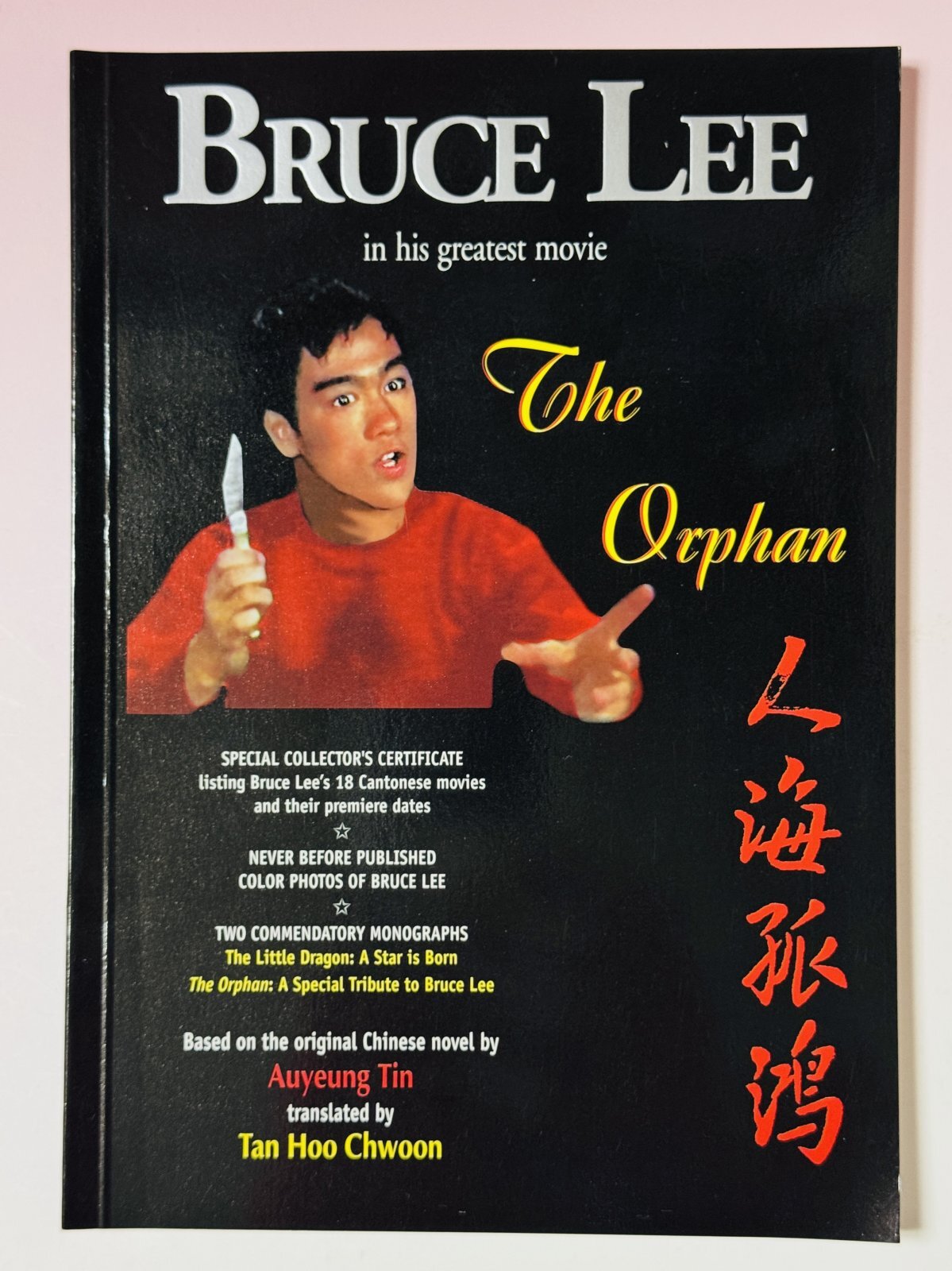 ■店長がまたまた倉庫から発掘した当時モノ。1990年代、ブルース・リー青年期の傑作『人海孤鴻』が見直され始めた時期にシンガポールで発行された、ブルース・リーが子役として香港で出演した映画の中でも、最も話題作となった『人海孤鴻』の原作を英語翻訳した限定本。カラー8ページにわたりブルース・リーの出演場面の貴重なカラー写真掲載。そして二つの研究論文 "The Little Dragon:A sta is Born" "The Orphan:A Special Tribute to Bruce Lee"も掲載した研究本。シリアルナンバーつきスペシャルコレクターズ証明カードつき(翻訳者 Tan Hoo Chwoon の直筆サイン入り)
