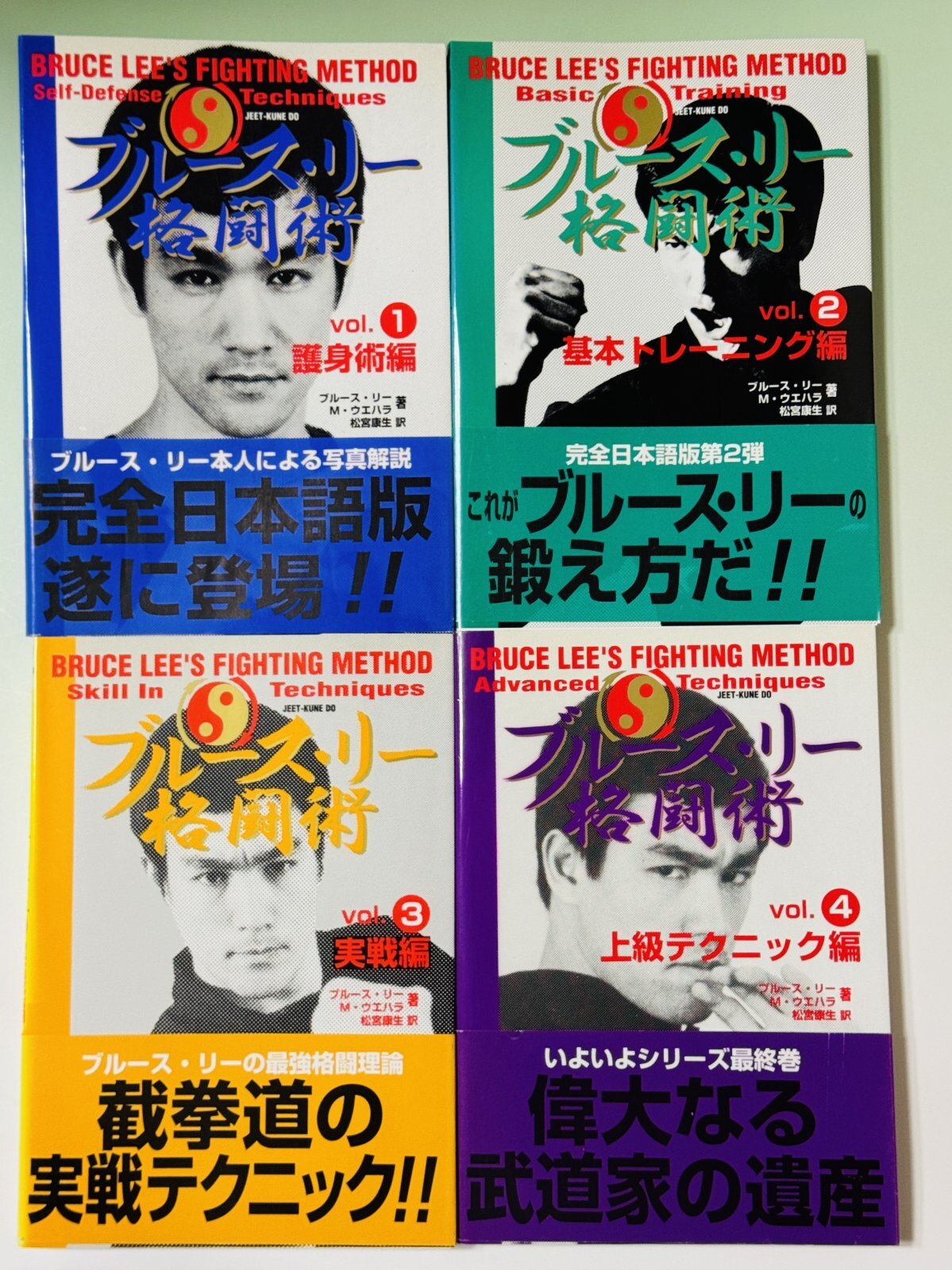 ■当店倉庫に眠っていた今では入手が難しい4冊セットをまとめて大放出。背表紙などに色あせがありますが、本の状態はかなり良く、新品同様。すべて帯付きなのもポイント高い!巻末の松宮康生ブルース・リーコレクションも今見ると楽しいね。