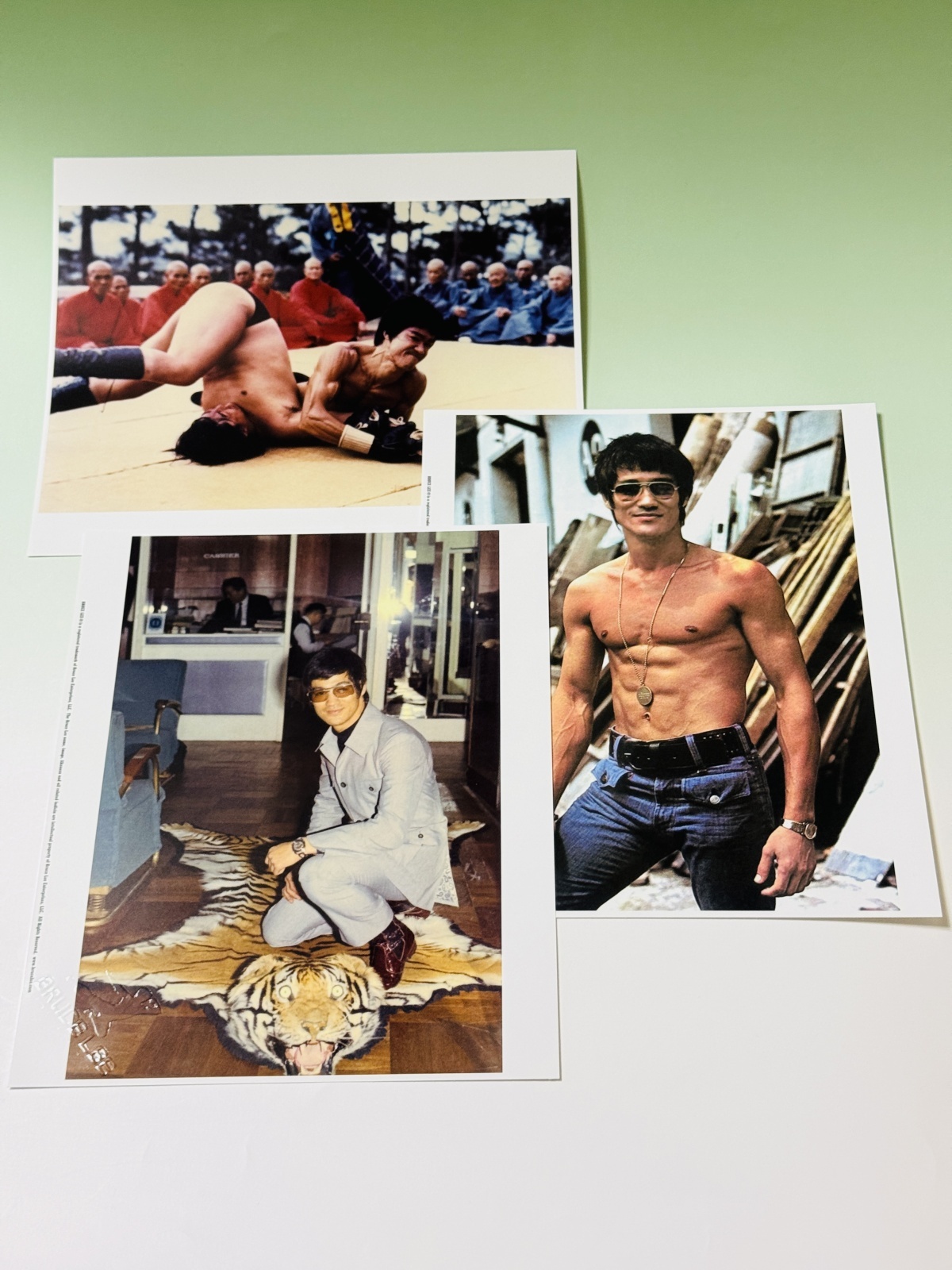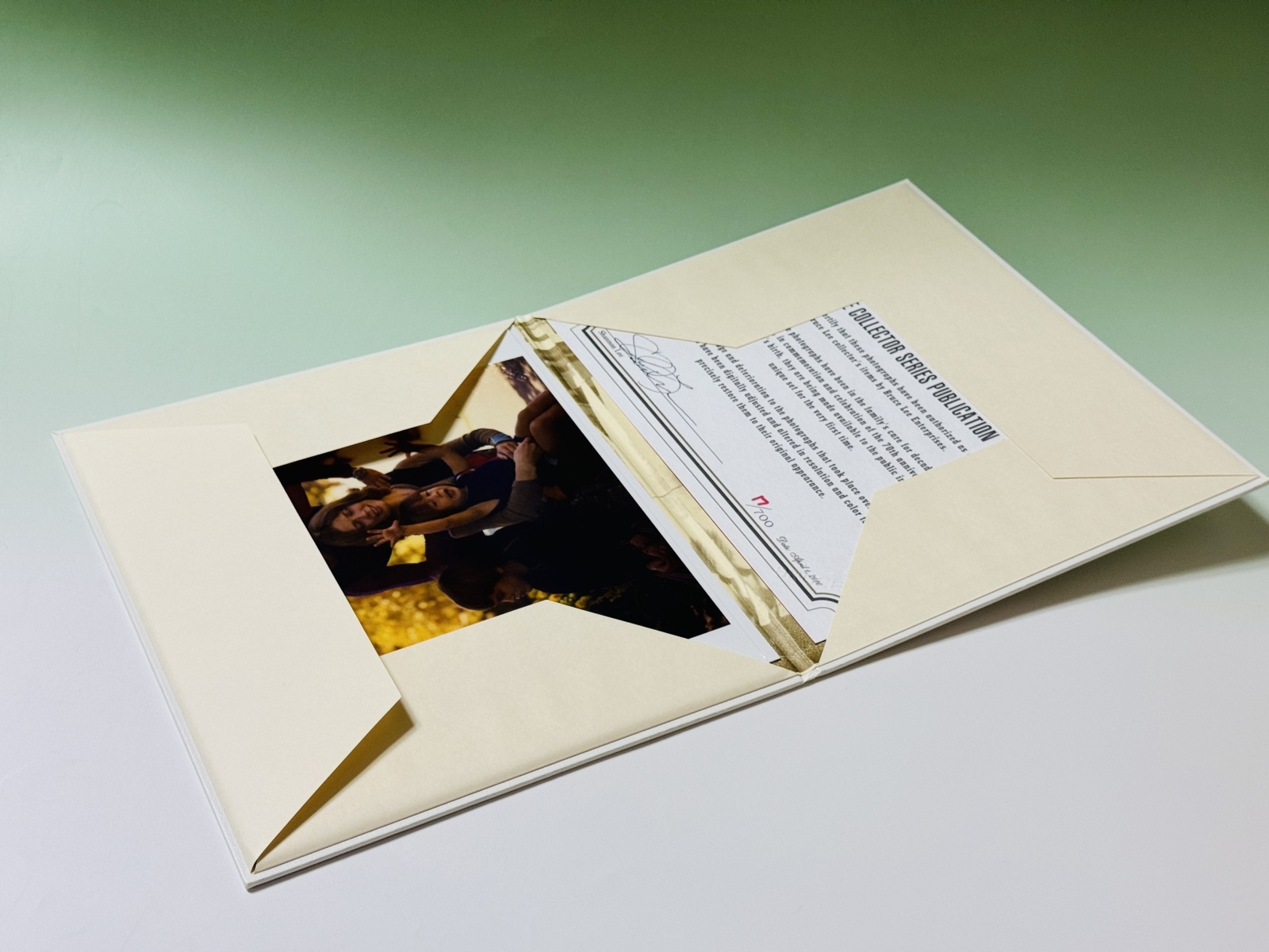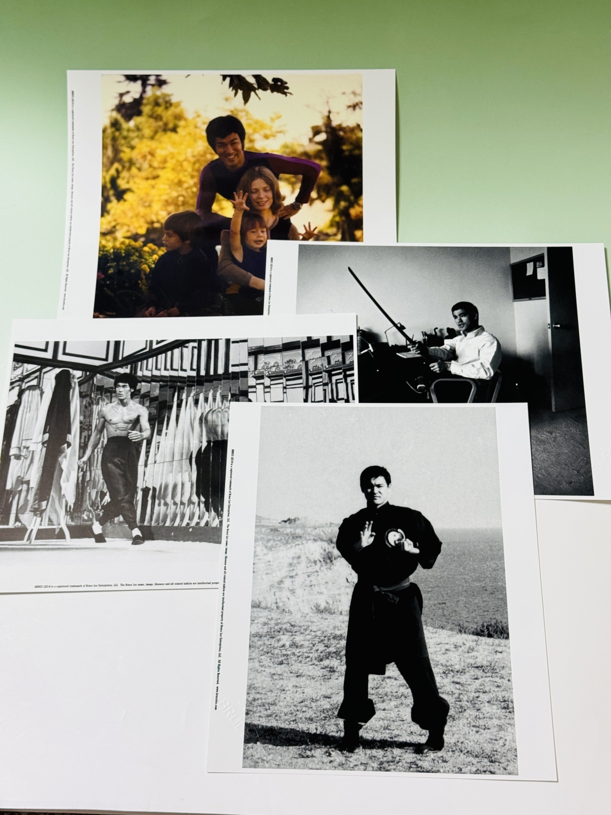 ■ブルース・リー生誕70周年を記念して2010年4月の10日間だけ東京で開催されたイベント「奇蹟のブルース・リー展」でのみ販売された記念グッズのひとつがこれ。大判美麗写真7枚と証明書、シャノン・リーからのメッセージカードを豪華ハードカバーフォルダーに収めたセット。さすが公式商品だけあって写真の精細度はお見事。限定700セットのシリアルナンバー入り証明書にはシャノン・リーの直筆サインが入っています。