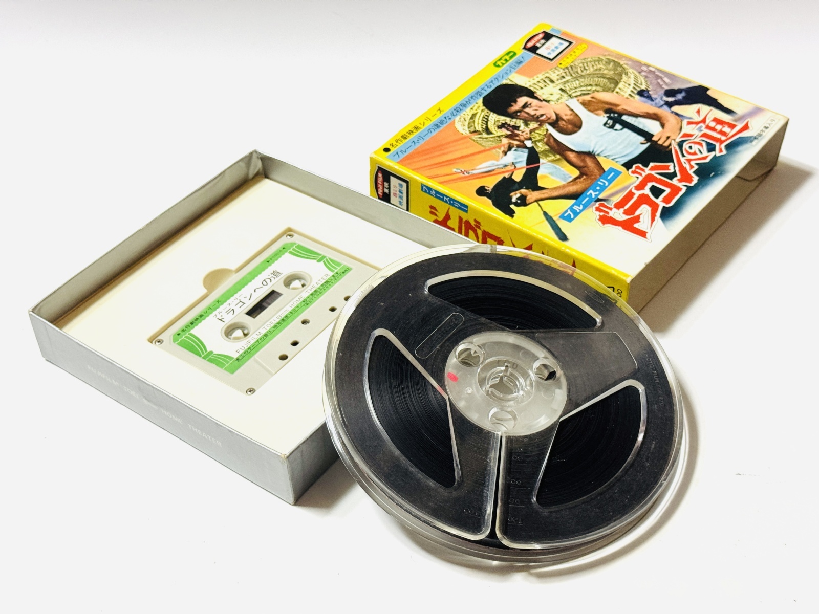 ■今日も店長は倉庫を捜索。発見したのは8ミリフィルム。8ミリビデオじゃーないですよ。今やビデオでさえも消えてしまった時代、アナログな8ミリフィルムのほうが長生きかも。東映とフジフィルムが製造販売していた8ミリフィルムによる名作劇映画シリーズの『ドラゴンへの道』。なんといっても自宅でブルース・リーが観られる!というのは画期的でしたね。編集も短くまとめられ、当時劇場で観られた字幕も楽しめます。